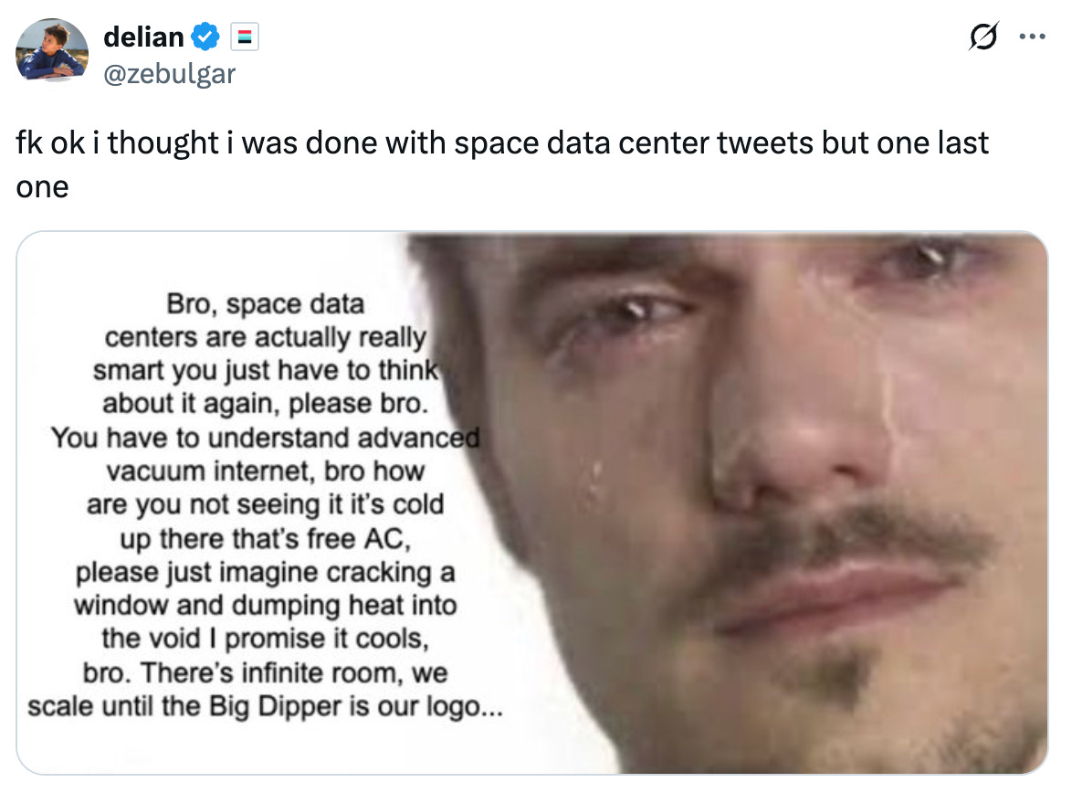 Delian Asparouhov has been one of the loudest “data centers in space” bears on the timeline and someone with the pedigree to have an opinion as the cofounder of Varda, a space research company that essentially manufactures pharmaceutical components in microgravity. One of his engineers had a bit longer take that’s relevant here: