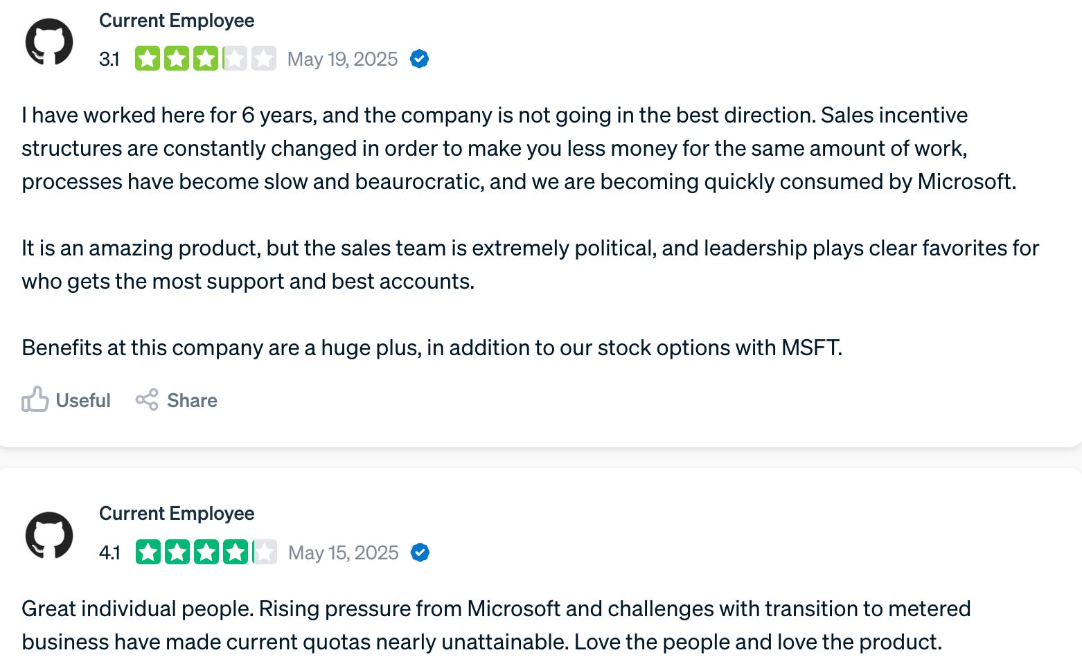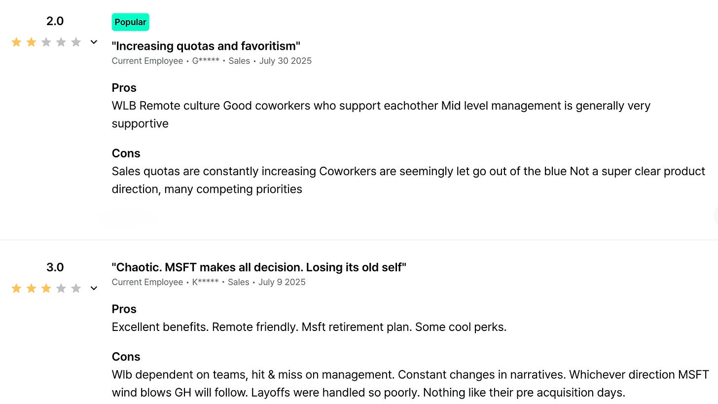 For tech sales: If you work for GitHub and were there for the culture/team/mission, it’s probably a good moment to accept that this stage is over. If you saw it as an entry point into selling for Azure, then you should consider what’s the shortest path to moving to a different role.