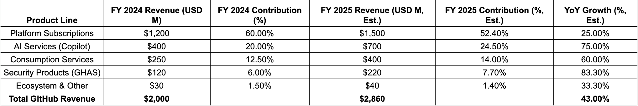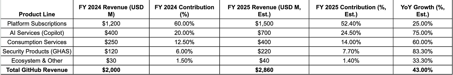 Interestingly enough, the business skyrocketed to $2B in 2024 following the successful launch and quick adoption of GitHub Copilot. Since then, we’ve seen a number of competing products capture bigger parts of the market share (Anthropic with Claude Code and Cursor), but it’s difficult not to call this a massive success.