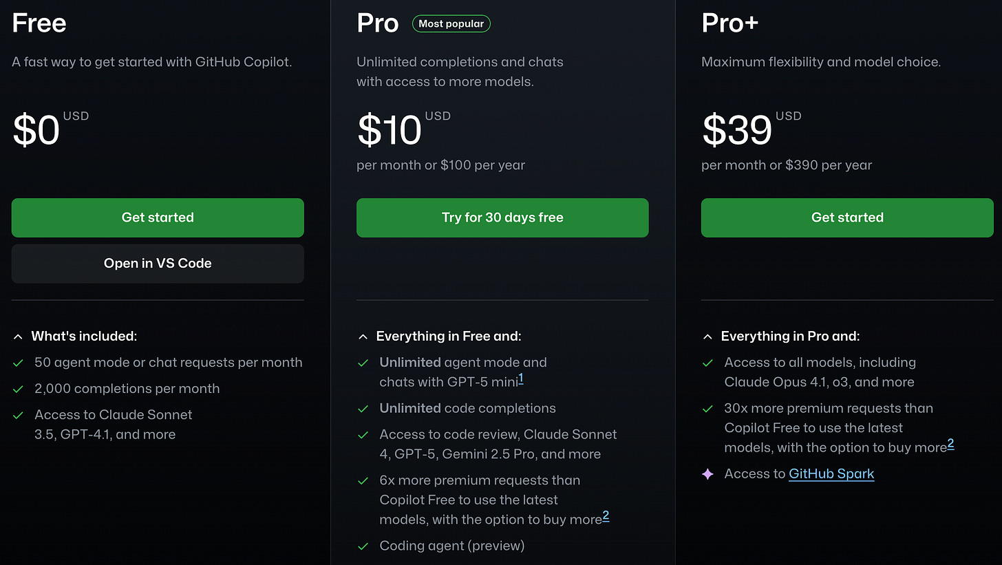 GitHub Copilot is a peculiar offering in today’s landscape since it’s clearly a subsidized market-share play rather than a like-for-like competitor. The free tier is basically legacy leftover infrastructure, while the “Pro” subscription is there for practical productivity optimization (auto completion of code), rather than a “companion SWE” or an “AI-native IDE”. Microsoft claims 20 million Copilot signups as of July 2025, which is a very interesting choice of language (i.e. anybody who installed the extension). Most likely we are looking at the 5M-7M range of paid corporate seats, the vast majority on the $10/month plan.