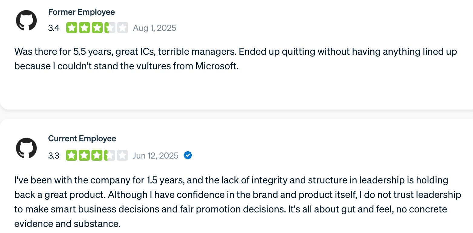 GitHub merging with CoreAI and losing “legacy” leadership opens the doors to a monetization drive that is very likely going to lead to developer-hostile choices. This might not happen immediately, but it would be a predictable outcome after the first 1-2 “bad quarters” under the new regime.