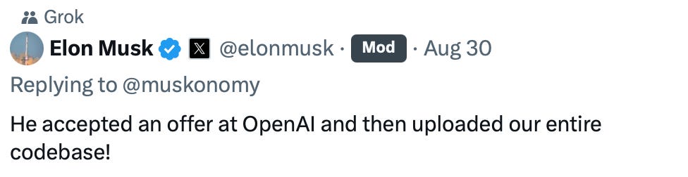Source: Elon Musk commenting on the lawsuit xAI filed against an ex-researcher