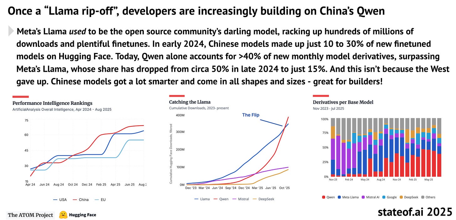 As covered this week in “Why behind AI”, while the LLM models most used today for commercial purposes and rank highest in terms of benchmarks and outcomes are all from frontier labs (OpenAI, Anthropic, DeepMind, and xAI), the world of open-source AI is almost completely dominated by Chinese companies.
