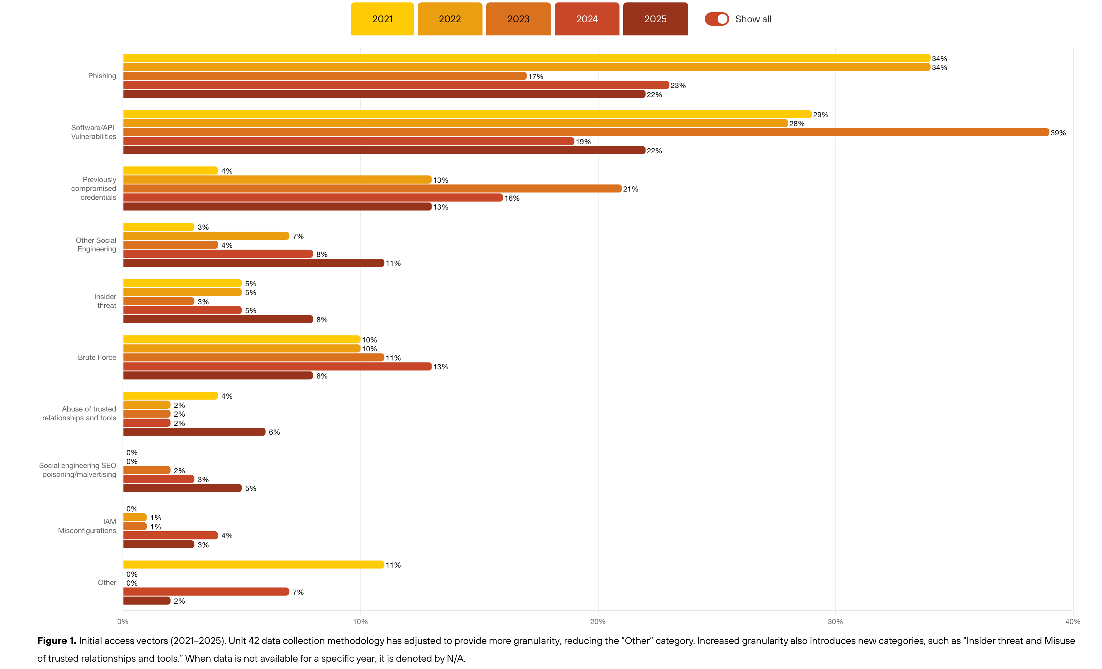 Unit 42 is PANW's managed security service that is used as an escalation point when companies need to contain significant breaches. Interestingly enough, according to their annual report, the majority of incidents are indeed correlated to identity breaches, which often go undetected due to a fragmented tool landscape; this has been the case for the last 5 years.