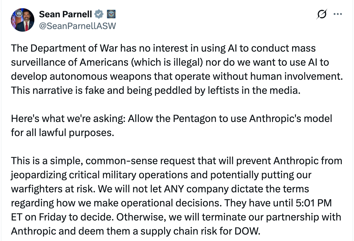 I've included the full memo since it outlines quite obviously a significant shift in how the US government is adopting AI, particularly when it comes to the work of the DoW. It's incredibly bullish for the frontier labs, as it basically guarantees wide adoption (including of the latest models as they get released). There is one "but" here, that Anthropic took offense at: