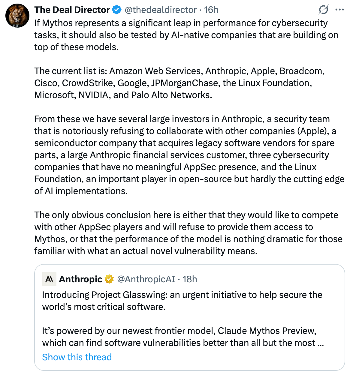 To put it more bluntly, Anthropic appears to be using Mythos to announce its official entry into the cybersecurity space (after the limited Enterprise preview for Claude Code security). The launch list is focused on large customers or investors of Anthropic and it wouldn’t be surprising if the model that launches via API is not enabled for cybersecurity companies to leverage in a product, similar to how they essentially banned OpenClaw usage by pushing it to API only.
