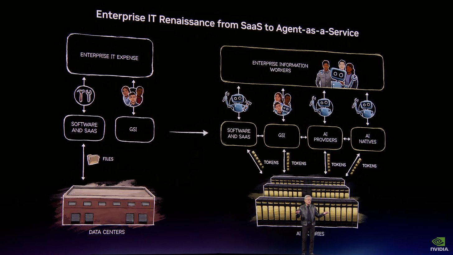 “Every single IT company, every single company, every company, every SaaS company will become a GaaS company. No question about it. Every single SaaS company will becoming a GaaS company and Agentic-as-a-Service company... This is enterprise IT before OpenClaw... It would pass through software that has tools and systems of records and all kinds of workflow that’s codified into it, and that turns into tools that humans would use. Digital workers would use. That is the old IT industry, software companies creating tools, saving files and of course, GSIs consultants that help companies figure out how to use these tools and integrate these tools. These tools are incredibly valuable for governance and security and privacy and compliance and all of that continues to be true. It’s just that post-Open Claw, post agentic, this is what it’s going to look like.”