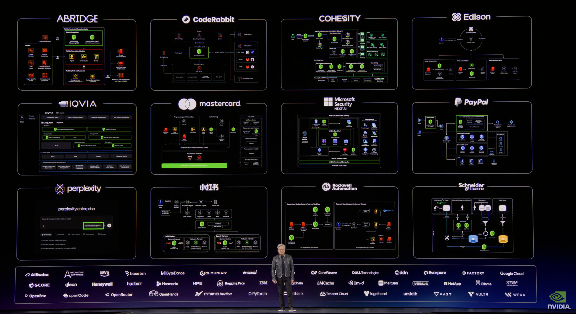 "Today, we're announcing a coalition to partner with us to make Nemotron 4 even more amazing. And that coalition has some amazing companies in it. Black Forest Labs, imaging company; Cursor, the famous coding company, we use lots of it; LangChain, billion downloads for creating custom agents; Mistral... incredible, incredible company. Perplexity, Perplexity computer, absolutely use it. Everybody use it. It is so good, a multimodal agentic system; Reflection; Sarvum from India; Thinking Machine, Mira Murati's lab, incredible companies joining us... I said that every single enterprise company, every single software company in the world needs an agentic systems, need an agent strategy. You need to have an OpenClaw strategy, and they all agree. And they're all partnering with us to integrate NeMo, the NemoClaw reference design, the NVIDIA agentic AI toolkit and of course, all of our open models."
