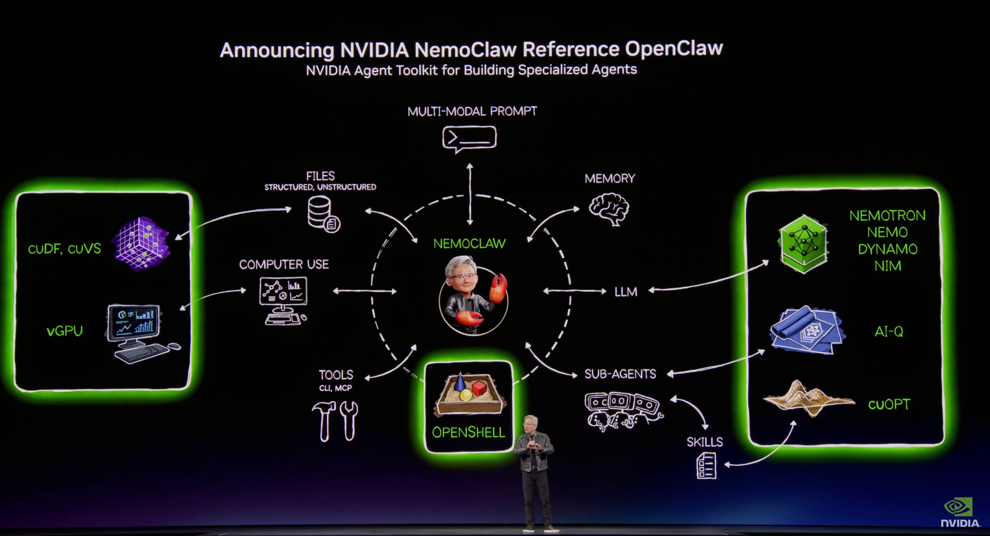 "What we did was we worked with Peter. We took some of the world's best security and computing experts, and we worked with Peter to make OpenClaw, enterprise secure and enterprise private capable. And we call that — this is our NVIDIA OpenClaw reference for Open — NemoClaw, which is a reference for OpenClaw, and it has all these agentic AI toolkits. And the first part of it is technology we call OpenShell that has now been integrated into OpenClaw. Now it's enterprise ready.