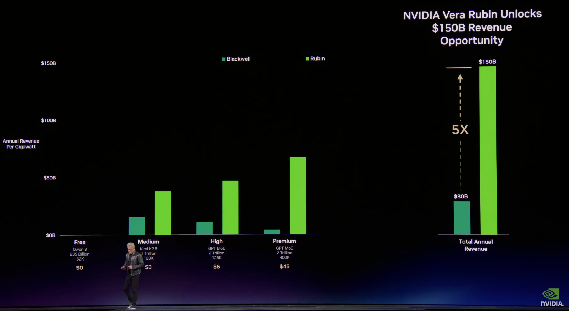 So this is about smarter AI models. And when you have smarter AI models, each one of these clicks allows you to increase the price. So this is $45. And maybe one day, there’ll be a premium model that allows you a premium service that allows you to generate token speeds that are incredibly high because you’re in a critical path or maybe you’re doing really long research and $150 per million tokens is just not a thing. Suppose you were to use 50 million tokens per day as a researcher at $150 per million tokens. As it turns out, as a research team, that’s not even a thing.”