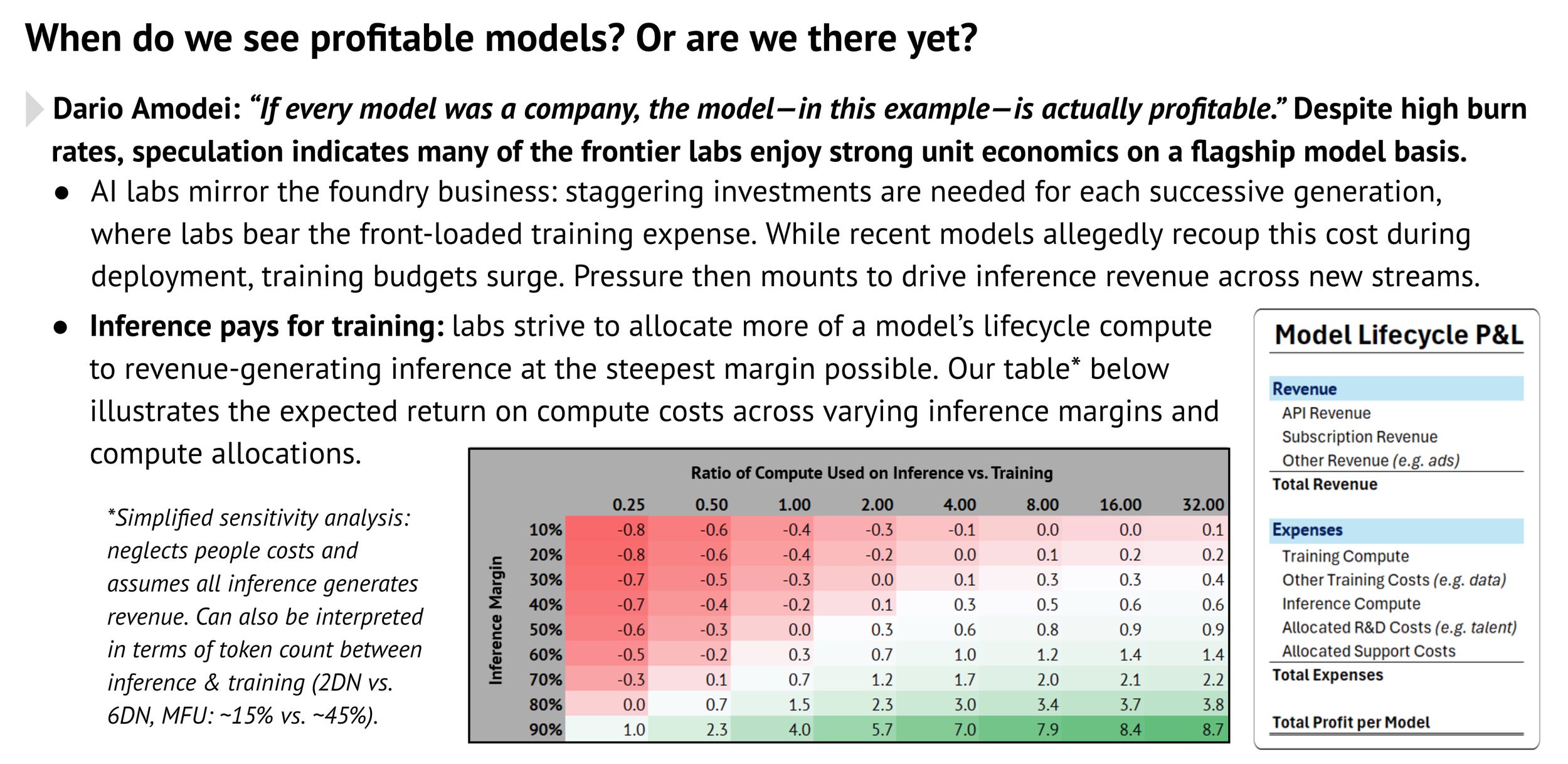 Since the investment is going into compute, then a more fair way of understanding the frontier labs’ business models is based on whether they are reaching reasonable margins and profitability from their existing training runs, which appears to be the case. So the businesses are sustainable, as long as they can turn a profit on each new training run or have enough buffer to absorb the impact when they are not able to deliver an improved product.