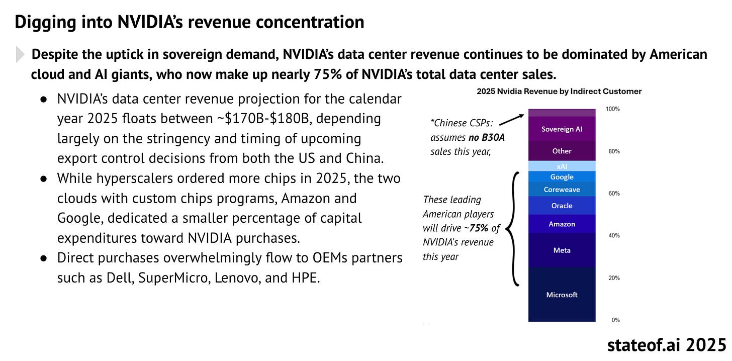 NVIDIA has been a big proponent of the concept of Sovereign AI, and Jensen has been advocating for it in multiple in-person meetings with heads of state. This has expanded their addressable market a little bit, but the reality is that 75% of all revenue comes from US frontier labs, hyperscalers operating on their behalf, or infra middlemen like Oracle and Coreweave.