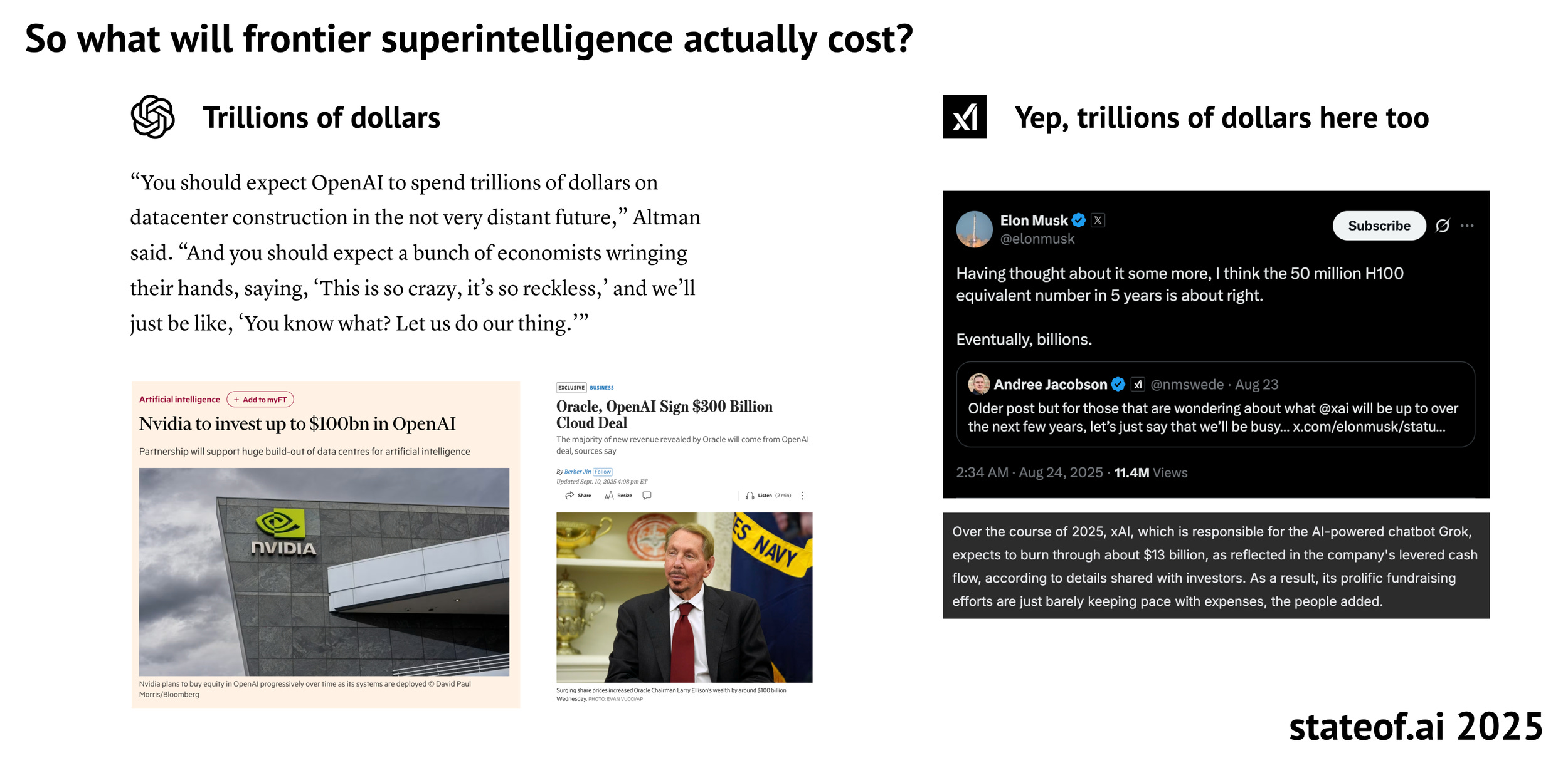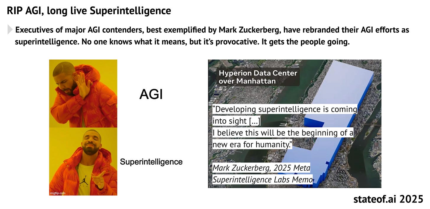 There was a big shift in communication in the last 12 months, as the frontier labs started talking more about “superintelligence” than AGI. There are different ways to interpret this, some cynical (allows us to raise more money), some practical (AGI as defined historically has been achieved but it’s inconvenient for OpenAI and Microsoft for legal reasons), some concerningly bullish (the leading researchers believe sentient AI that’s significantly more capable than us will be created within a few years due to scaling laws).