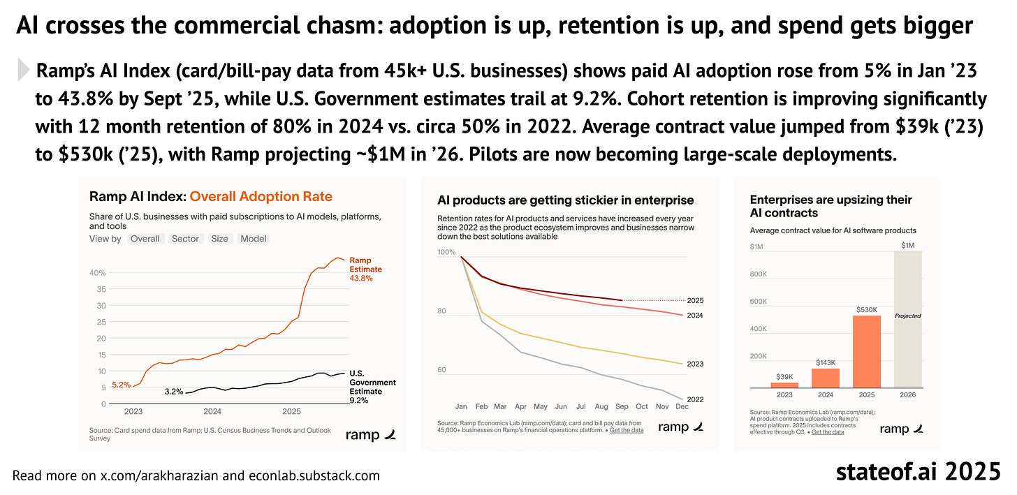 Some of the most reliable data we have is simply based on spending patterns, i.e. where B2B dollars are going. Based on the figures seen by Stripe and Ramp, it’s clear that the growth announcements by AI-first vendors mostly map against the actual spending patterns seen in a selection of their customers. There is an obvious gap here: selection bias (i.e. companies that run on Ramp or Stripe for their payment infrastructure are more likely to also adopt other AI-powered tools), but this is normal at a stage of the market where we are still talking about early adopters as the key demographic.