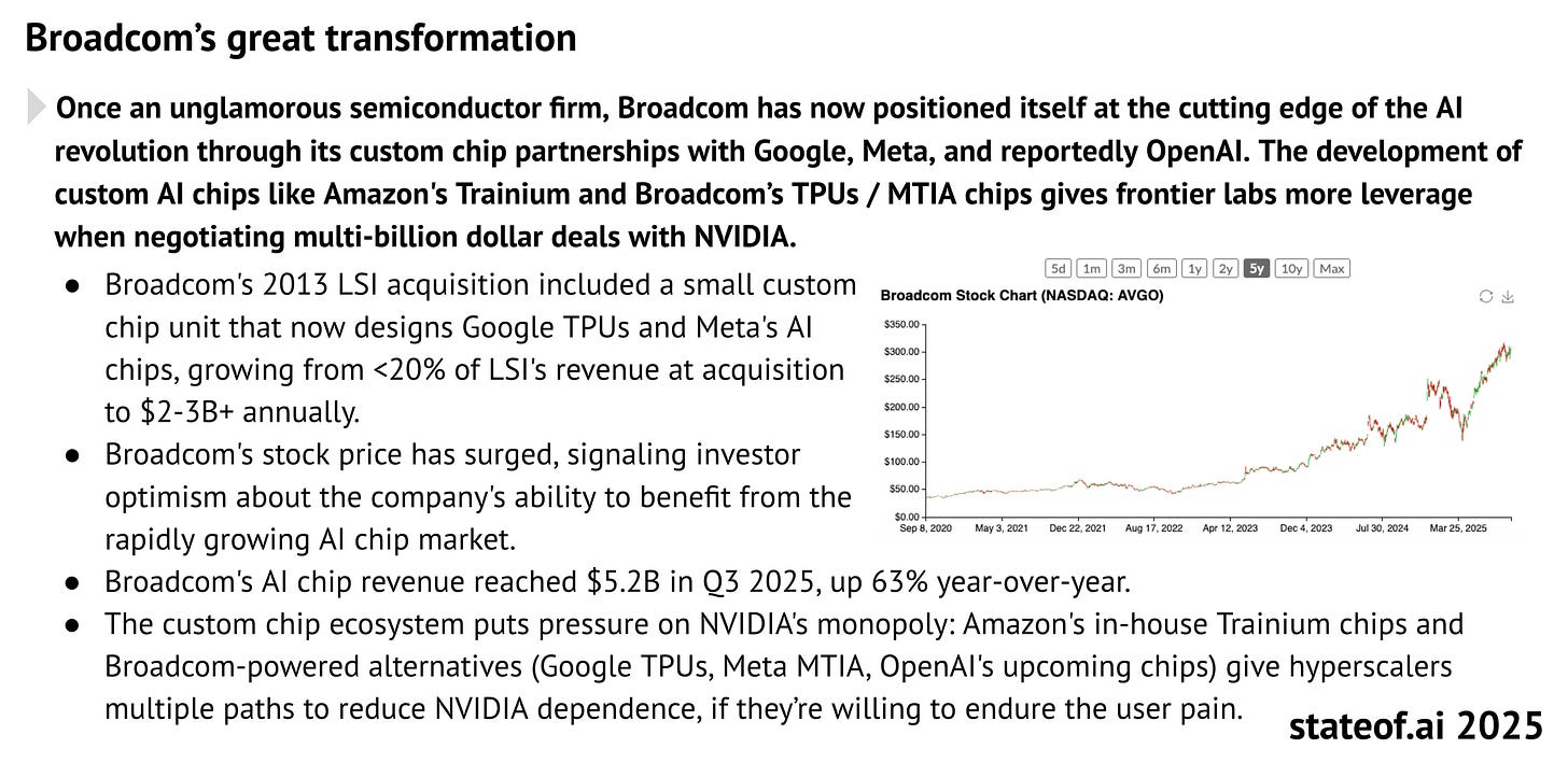 One of the biggest winners behind the scenes has been Broadcom, which has taken a significant role in building out custom hardware based on the needs of the frontier labs. While it’s debatable whether this actually gives them an edge or if it’s simply a diversification play, the 3x of their stock in the last two years speaks for itself.