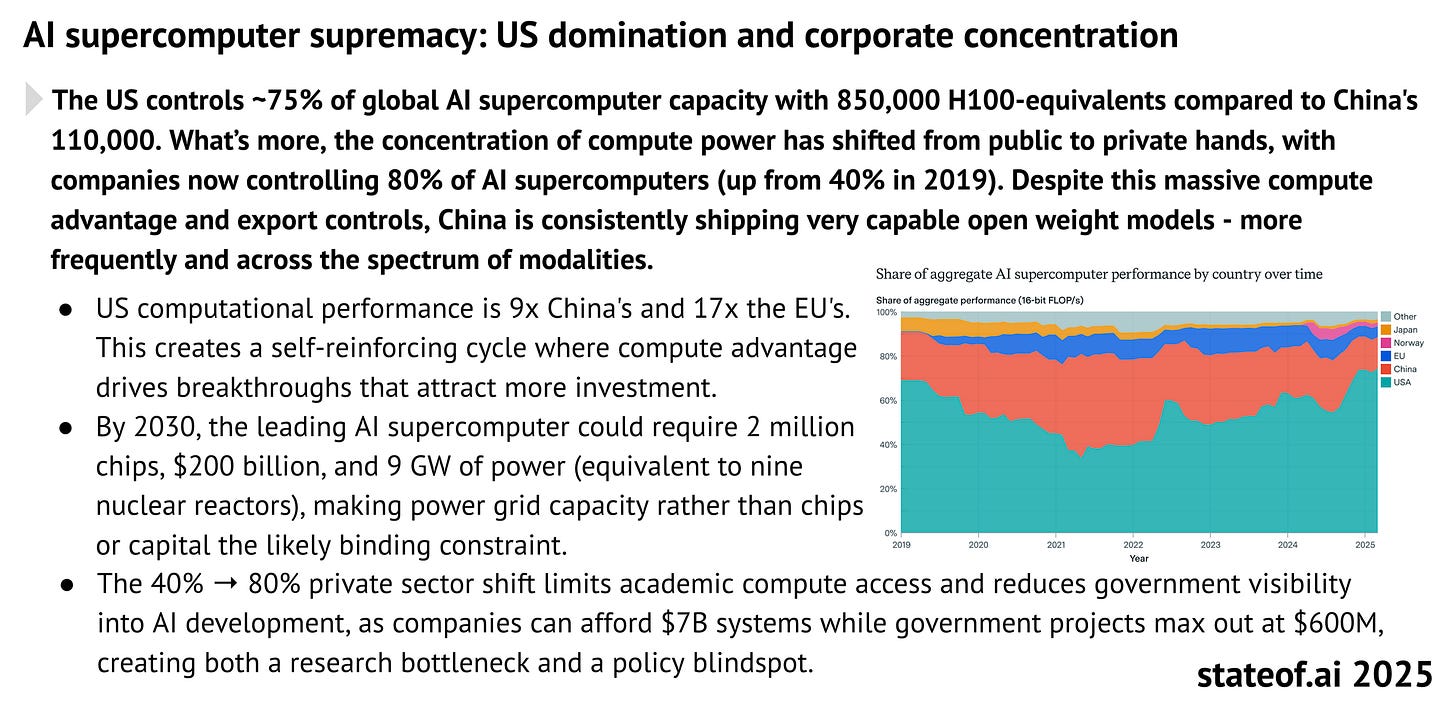 Currently, the reality is that the US dominates both training and inference capacity. There has been an aggressive effort across multiple players to maintain the lead, together with consistent export controls and technological lead in utilizing EUV-printed chips (i.e. high efficiency and more compute per W). The other side of the coin, however…