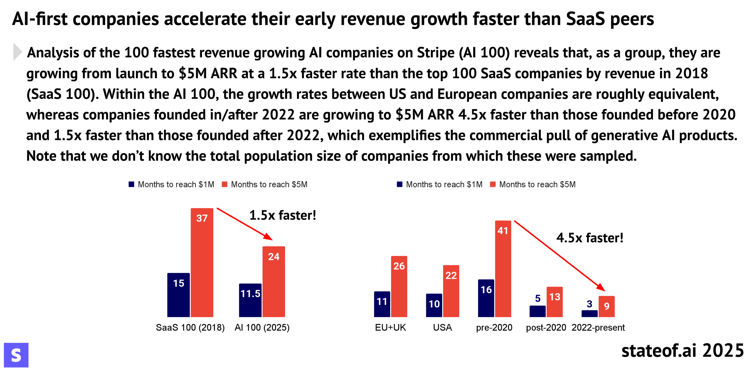 Companies that base their value proposition on AI and operate internally with an AI-native tech stack are growing at significantly faster rates than how SaaS performed historically. The pace of growth is even more incredible if we account for the fact that SaaS peaked during the COVID bubble and many of the companies we consider “rocketships” of the pre-2023 era look almost like laggards from today’s point of view.