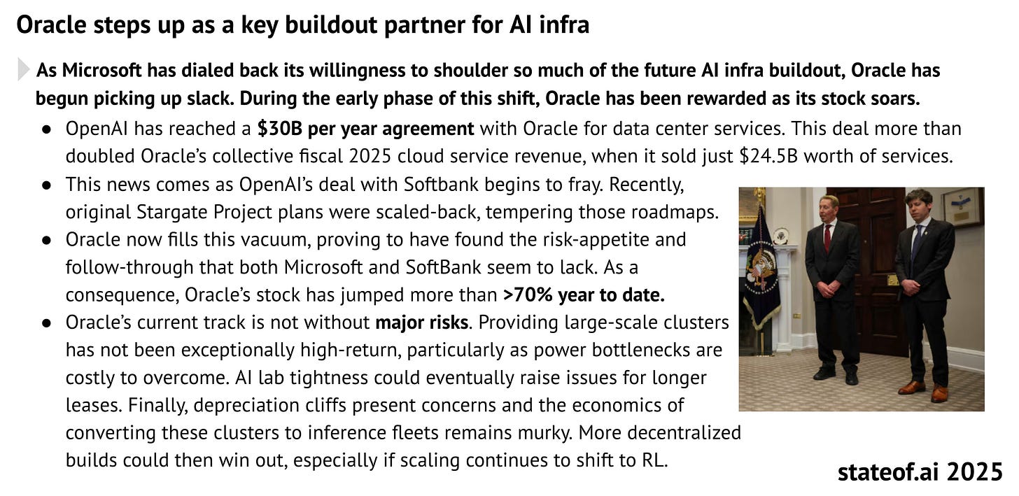 While Oracle clearly has been able to capture a lot of attention due to their work with OpenAI, the reality is that the build out of AI infrastructure is such a massive undertaking across the chain that it has become a “sport of kings”. There will be no “innovative startups” disrupting the infra layer.