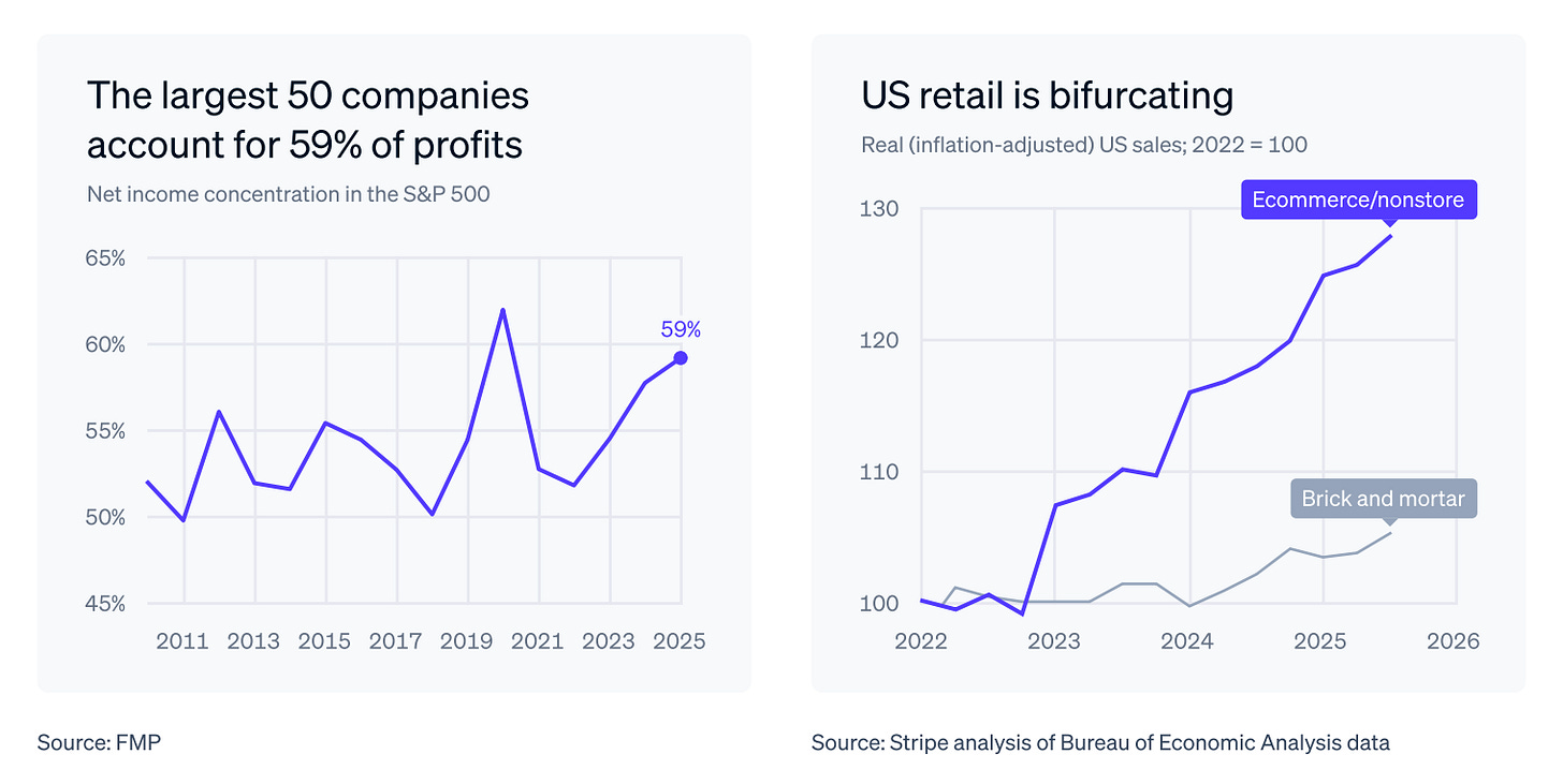Much of this is driven by bifurcation within industries. In retail, for example, US brick-and-mortar sales grew just 5% over the past 3 years, whereas ecommerce sales grew 30% over the same period (both in inflationadjusted terms). In air travel, the “big 3” of American, Delta, and United all increased their share of industry revenues and profits over the past decade. (Indeed, Delta and United accounted for nearly all US airline profits in 2025.)